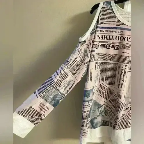 Honeyme pink cotton blend top/tunic cold shoulder newspaper novelty print. Large - $25 - From Ghadeer