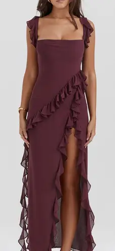 Elegant asymmetrical dress with ruffle details. Features a deep plum color. Perfect for evening wear... Show more