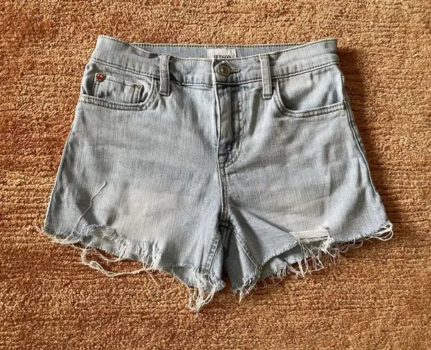 Hudson “Gracie” jean shorts in light wash denim with raw frayed hem and distressed details. Size 24.... Show more