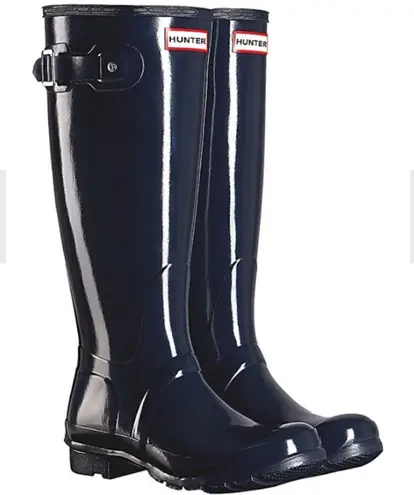 Great used condition! Dark navy blue extra tall Hunter rain boots. Silver buckle on outer top sides... Show more