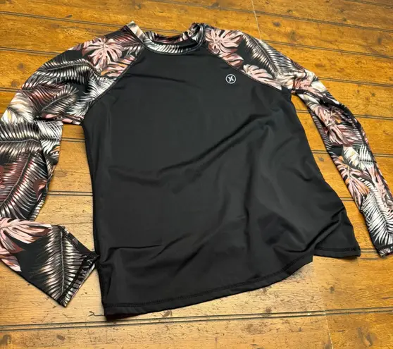 Hurley women's long sleeve rash guard in black with a vibrant tropical leaf print on the sleeves. Th... Show more