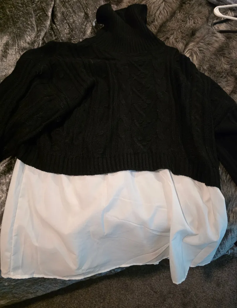 Elegant black turtleneck with a contrasting white hem. Perfect for a chic, layered look.