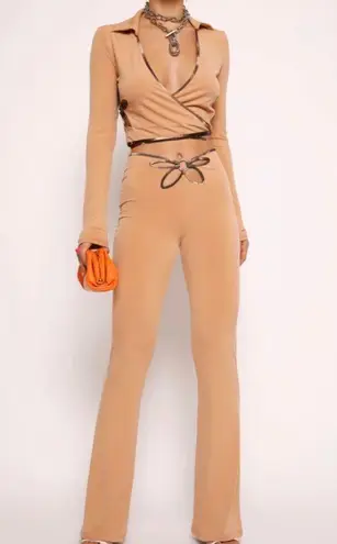 Brand new 2 piece set Bottoms:xxs Top:xs Long sleeve, stretchy wrap top in tan with custom GIA p... Show more