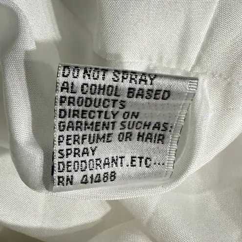 IEENA for Mac Duggal Tailored V-Neck Ballgown Women's 8 White A-Line NWOT Elegant and streamlined ballgown with a layered A-line skirt. V-neck Shoulder straps Concealed back zip Seamed waist Full A-line skirt Polyester Horsehair underskirt Dry clean Imported Size 8. Condition is very good. Minor thread pulls. No other flaws noted. Approximate flat measures: - Armpit to armpit: 18 in. - Waist: 16 in. - Length: 65 in. Smoke-free home Wedding, bride, cocktail, party, elegant, feminine, prom