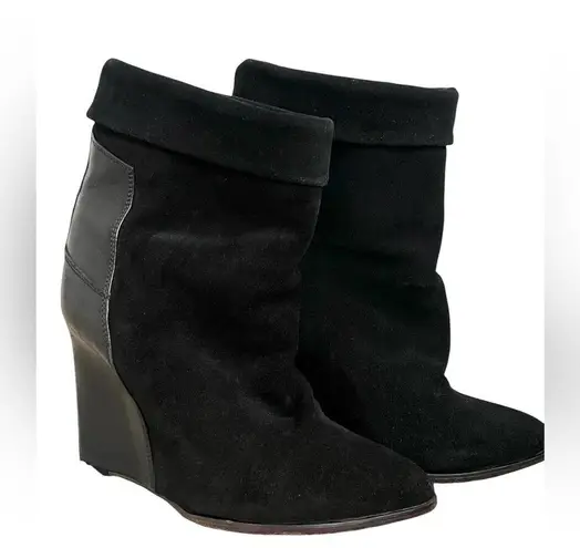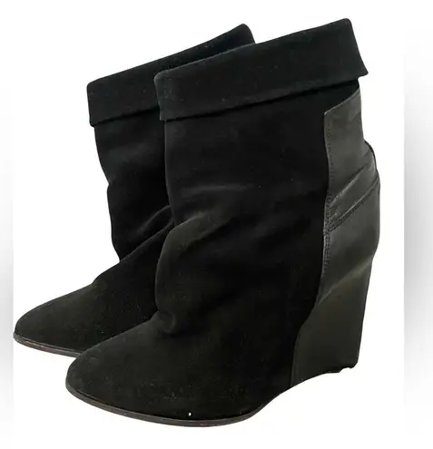 The boot is identified as the "Darlon" model from the brand IRO. • Design Features: It is a wedge boot featuring a fold-over shaft and a smooth leather panel that extends over the sculpted wedge heel. • Material and Origin: The boot is made with suede and calfskin leather, and it is manufactured in Italy. Design: Edgy suede booties with a fold-over shaft and a smooth leather panel extending over the sculpted wedge heel. • Material: Leather sole, calfskin leather. • Heel Height: 4 inches (100mm). Wore once Size 36