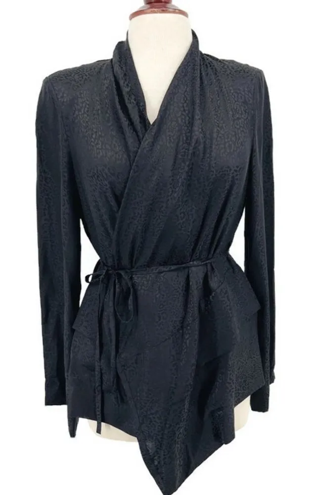 IRO Fernel Silk Leopard Print Wrap Blouse - Size: 36 (US S) - Condition: Gently worn, excellent preowned condition. - Color: Black - Tie waist, wear open or tied closed - Shoulder pads - 100% Silk Approximate Flat Lay Measurements - Underarm to underarm: 24" - Length: 30" - Waist: 21" SKU: 2255 Career, job, office, professional, business, modest, classic, work, classy, polished, classicore, old world aesthetic, old money aesthetic, old money chic, quiet luxury, stealth wealth, dinner date, date night, day to night