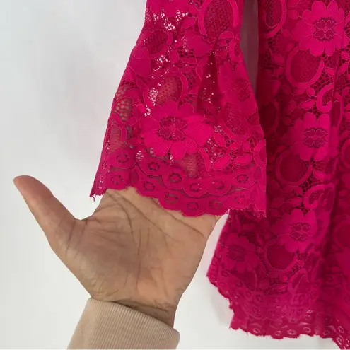 IMNYC Fuchsia Lace Flared Sleeve Peplum Blouse Size XS Chic fuchsia lace blouse. Features flared... Show more
