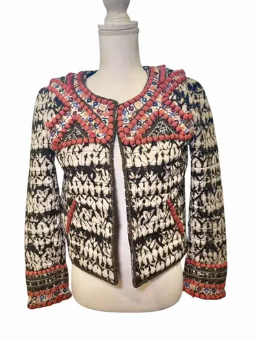 A true collector’s piece from Isabel Marant, this intricately embellished jacket blends the brand’s signature bohemian-meets-parisian aesthetic with couture-level detailing. The quilted cotton base is adorned with bold coral beading, mirrored accents, and geometric embroidery — creating a striking, textural statement from every angle. Wear it over denim, dresses, basics, or layered for fall/winter styling. This is a standout wardrobe piece that elevates any look. Details: • Brand: Isabel Marant (authentic) • Color: Black, cream & coral with mirrored + beaded embellishment • Shell: 100% Cotton • Lining: 100% Cotton • Filling: 100% Polyester • Quilted construction • Hook-and-eye or open-front styling (depending on model) • Fully embellished neckline, shoulders, hem & cuffs • Incredible craftsmanship and weight • Made with premium materials (see tag photos) Condition: Excellent pre-loved condition. All embellishments intact. No major flaws noted. No size tag