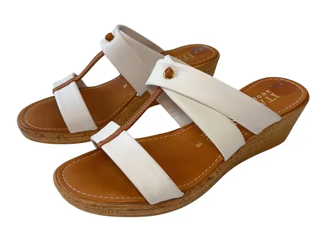 Step into effortless Italian style with these chic wedge sandals. A symphony of comfort and sophistication, these slides feature a crisp white leather upper, artfully arranged in a modern, minimalist design. The rich brown insole provides a warm contrast, while the subtle wedge heel offers just the right amount of lift for all-day wear. Crafted in Italy, these sandals embody quality and timeless elegance. Perfect for a sunny brunch, a casual day at the office, or a relaxed evening stroll. Gently used. Features: Comfort, Slip-On, Made in Italy, Lightweight, Character: Italian Style, Summer, Casual, Elegant, Minimalist Keywords: Italian Shoemakers, wedge sandals, slides, white leather, Italian shoes, leather sandals, slip on sandals, casual sandals, summer shoes, comfortable sandals, made in Italy, womens sandals, size 8, brown insole