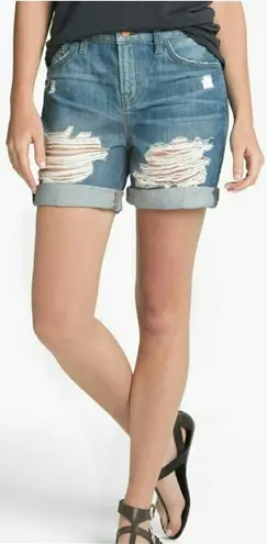 Shredded thighs and patches of distressing combine to create a vintaged effect in denim shorts with... Show more
