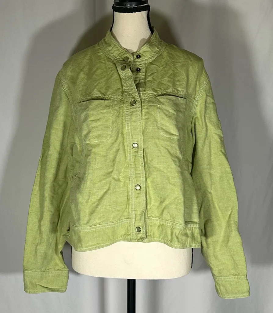 The J. Jill Linen Blend Jacket in size L Petite is a stylish and versatile piece perfect for casual or business occasions. The lime green color adds a pop of color to your outfit, while the pearl snap accents give it a touch of sophistication. With a mid-length and long sleeves, this jacket is suitable for all seasons and features a snap closure and front pockets for added convenience. Made from a comfortable linen blend material, this basic jacket from J. Jill is a classic addition to any woman's wardrobe. ** please observe the measurements well before ordering. This is a petite size! Also, please note the name that is written on the tag. **