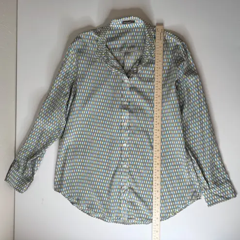 Elegant silk blouse featuring a captivating geometric print. This stylish top offers a relaxed fit with long sleeves and a classic button-down design, making it a versatile addition to any wardrobe. The unique pattern, with its blend of colors, adds a touch of sophistication and visual interest. The lightweight fabric ensures comfortable wear, perfect for layering or wearing on its own. Ideal for a business casual setting, a weekend brunch, or an evening out. Color: Blue Type: Blouse Department: Women Style: Basic Material: Silk Neckline: Collared Sleeve Length: Long Sleeve Sleeve Type: Classic/Fitted Sleeve Accents: Button Pattern: Geometric Features: Lightweight, All Seasons, Easy Care, Luxury Fabrics Fit: Relaxed Keywords: J.McLaughlin, silk blouse, long sleeve top, button down shirt, geometric print, womens top, designer blouse, dressy casual, work blouse, silk shirt, blue blouse, retro print, vintage style, Professional, Business, Button Down, Collared Shirt, Long Sleeve, Timeless, Classic, Minimalist, Normcore, Capsule Wardrobe, Preppy, Ivy League, Academia, Sophisticated, Neutral, Vintage Inspired, Travel, Resort Wear, Elegant Excellent Pre-Owned Condition (see pics for details) Flaws: No visible flaws. Measurements: included in photos. Please compare the measurements to something you already own for a great fit! Fast shipping: Shipped out next business day! Please let us know if you have any questions!