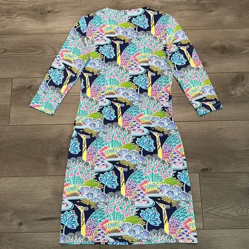 J. McLaughlin Carly Paradise Print Sheath Dress Multicolor Size XS. Excellent condition! 91% Nylon/9% Spandex. Luxurious Catalina Cloth. Seek V-Neck sheath dress. 3/4 sleeve length. Dress may fall at or above need depending on your height. See pictures for measurements