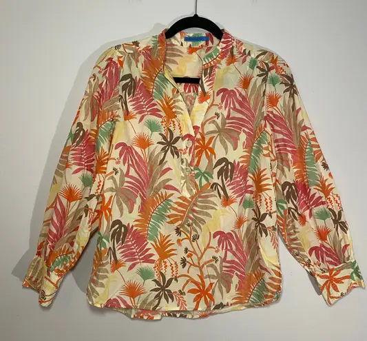 Add a touch of paradise to your wardrobe with this vibrant J. McLaughlin tunic blouse! Featuring a colorful tropical print, this long-sleeve top is perfect for adding a pop of fun to any outfit. Made from comfortable cotton, it offers a flowy and relaxed fit, making it ideal for warm weather or casual outings. **Features:** - Brand: J. McLaughlin - Style: Tunic Blouse - Sleeve Length: Long Sleeve - Print: Colorful Tropical - Material: Cotton - Fit: Flowy - Size: Medium Measurements as pictured. In fair pre-owned condition, PLEASE NOTE THE LARGE HOLE AT THE RIGHT UNDERARM. Always feel free to ask any questions you may have! Reasonable offers accepted. tropical, tunic, cotton, lightweight, flowy, breathable, vacation, resort