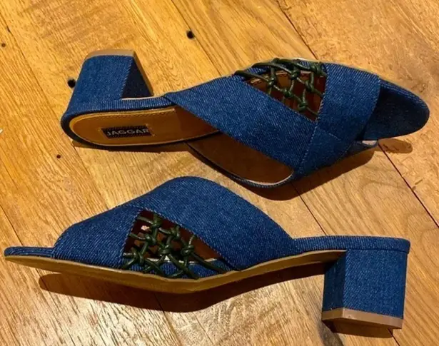Jaggar Denim Block Heel Mule Slides w Evergreen Lattice Work Size 39 US Blue - $46 - From Lysander
