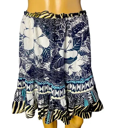 stunning Jams World mini skirt, perfect for a tropical getaway or a vibrant everyday look. The skirt features a beautiful black and white floral print with large hibiscus flowers on the top tier, followed by a middle tier with a geometric tribal pattern and a touch of light blue. The bottom tier is a bold black and white zebra print with a ruffled hem, giving it a playful and feminine flair. Made from Jams World's signature lightweight voile fabric, it's comfortable, breathable, and perfect for warm weather. The waist is elasticized for a flexible fit. •Measurements Length 20” Waist with no stretching 14” Fabrics 100% Rayon Jams World, mini skirt, tiered skirt, ruffle skirt, tropical print, hibiscus print, zebra print, floral skirt, black and white, Voile, bohemian, boho, resort wear, summer skirt, vacation, beachwear, elastic waist, fun print, Y2K fashion •Gently Used Condition