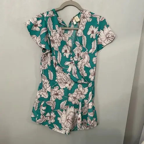 A teal floral print romper jumpsuit. Short sleeves and a V-neckline create a flattering silhouette,... Show more