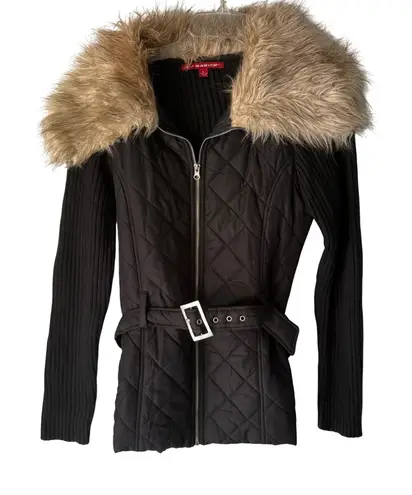 J.Basics Y2k Black Quilted Belted Jacket Faux Fur Collar Knit Sleeve Womens Type: Jacket Outer She... Show more