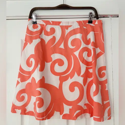 Chic A-line skirt with bold coral and white swirl design. Ideal for a vibrant look.