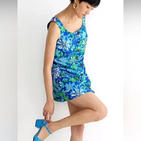 Multicolor bright blue green and white floral print sleeveless mini shift dress, button front, 100%... Show more