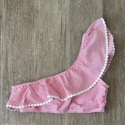 Seersucker, pretty ruffles, circle trim, this one-shoulder bikini top just took your pool-slash-beac... Show more