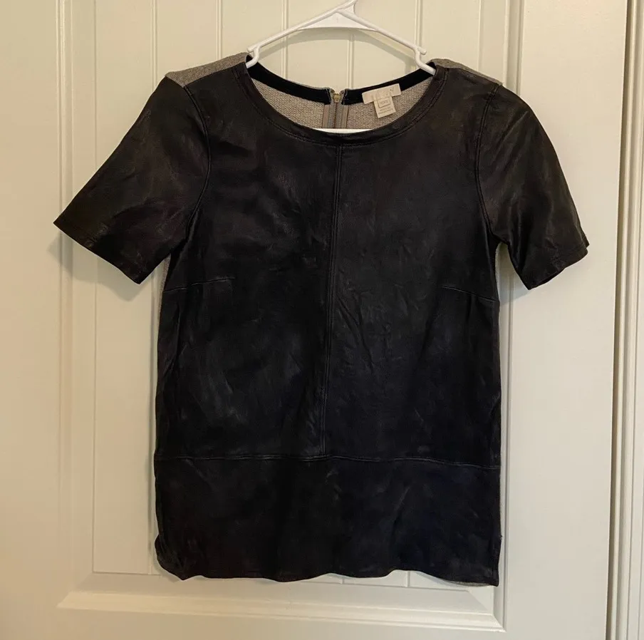 Women’s J. Crew top. Top has a full front black leather & full back gray knit design. Zips up the ba... Show more