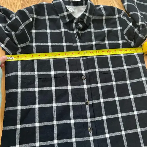 Stylish black and white plaid button-up shirt. Perfect for casual wear.