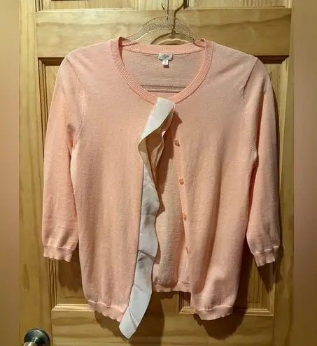 J Crew cardigan sweater, featuring a ruffle detail down the front. The sweater is a soft peach color... Show more