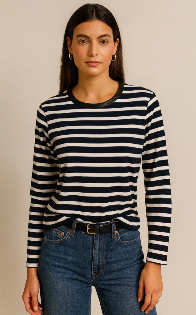 Parisian-chic perfection 🖤 J.Crew black and white striped top with faux leather detailing at the ne... Show more