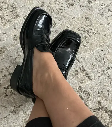 Stylish, low heel, sleek black patent leather loafers. Perfect for any occasion, these shoes offer b... Show more