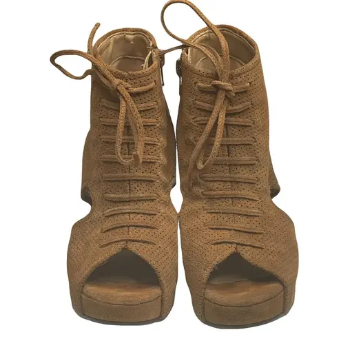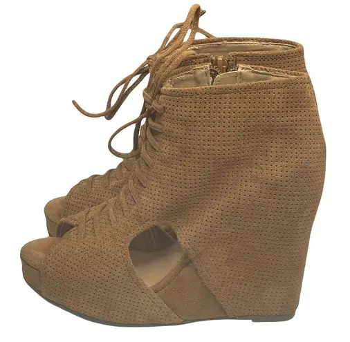 Jeffrey Campbell Havana Last Mary Roks Perforated Suede Wedge Open Toe Booties in Cognac Size 6M M... Show more