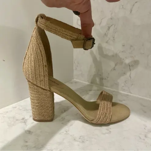 Jute wrapped upper and rubber sole. Made in China. Ankle buckle closure. Jute wrapped heel. Angled a... Show more