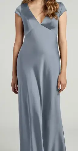 Style Courtney: Luxe Satin, cap sleeve V-neck dress with empire waist seam, keyhole back and bias cut skirt by Jenny Yoo Purchased at a sample sale and never worn. Color is whisper blue.