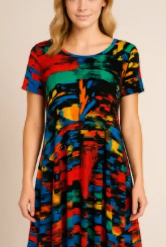 Short sleeve Round neckline All over abstract print Multicolor Pullover styling Stretch Machine washable for easy care Made in USA 95% Polyester 5% Spandex Length - 36" Across chest - 21" Some photos may contain an AI-created model wearing the actual item to show fit. This item is in excellent pre-owned condition without any blemishes Ships from a smoke-free and pet-free environment Packaged with care Trusted seller; ships quickly 90s, Art, Bohemian, Colorful, Tropical, Bold, Wearable Art, Art to wear, Boho, Fun, Abstract, Lagenlook, Comfy, Comfortable, Casual, Weekend, Polished, Flowy