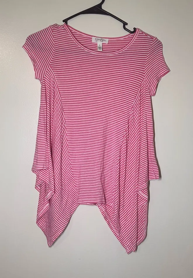 Chic pink striped top with short sleeves. Flowy and comfortable design.