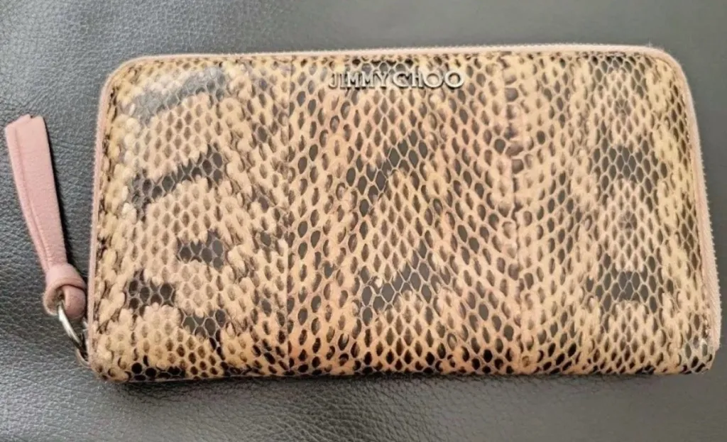 This wallet is a suave creation from the house of Jimmy Choo. Crafted from exotic python skin, the wallet features a zip-around closure that opens to a leather and fabric interior equipped with multiple card slots and compartments for easy organization Stylish snake print wallet by Jimmy Choo. Features a chic design with a pink zipper pull. Please note that this item is pre- owned and not new. As such, it may show signs of wear or other minor imperfections.See photo