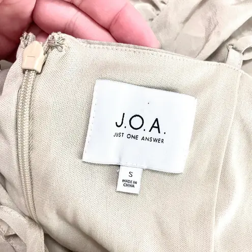 This is a gently used J.O.A Tan Fitted Front Tie Ruched Mini Dress Size S. In excellent condition. M... Show more