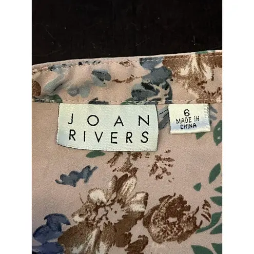 Gently worn with fabric clean and vibrant. No stains, holes, or snags. Buttons and sleeve ties are secure and functional. Brand: Joan Rivers Style: Womens floral button front blouse with split V neckline and tunic length silhouette. Color: Light blush pink background with purple, green, and blue floral print. Size on tag: 6 Material: 100% polyester; made in China. Details: Full button front closure, 3/4 length sleeves with tie cuffs, curved hem, back yoke with center pleat, lightweight woven fabric ideal for layering or wear on its own. PTP 20" Length 30" bin 59 2219