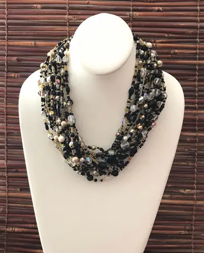 Gold Tone 19" with 3" extender. Crystal Clear & Black Glass with Gold seed beads. Fashion Costume Jewelry. Signed/Stamped. Faux pearls. Casual, Boho, or business wear accessory. Add bling and sparkle to any outfit. Statement piece. Photo with ruler, is for scale reference only. Visit my closet for a large selection of wonderful jewelry. Please see photos, as they are part of the description. 1448Q-C20 DM