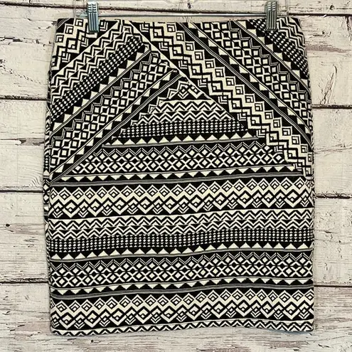 Gently used knit skirt in a pull on style. Black & white pattern, no pockets. 95% polyester/5% spandex. Waist measures 15.5" (but is stretchy) and length is 20.25" from waist to hem.