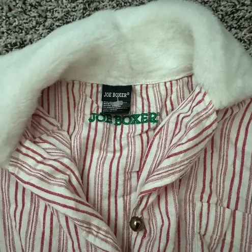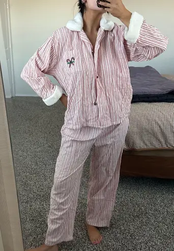 Candy cane red and white stripes Fluffy white faux fur collar and sleeves Long sleeve Candy cane em... Show more