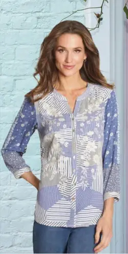 John Mark Embroidered Floral Top Size Petite Medium Mixed Print Stripe Boho Blue - $40 - From Samantha