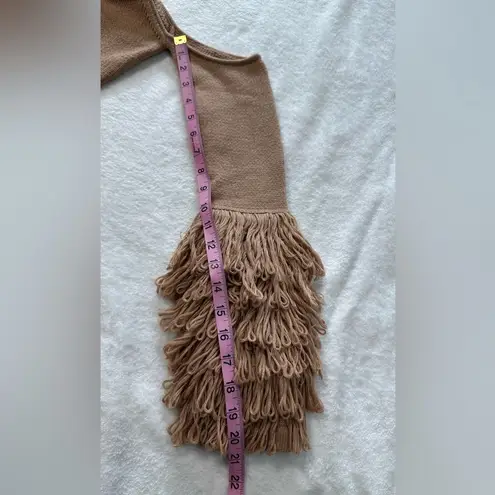 This Jonathan Simkhai sweater in a warm tan shade showcases a stylish turtleneck and eye-catching fringe details at the cuffs. The cold-shoulder design and ribbed knit texture enhance its modern appeal, making it a standout piece for any occasion. excellent Condition