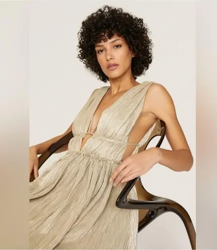 Size large Condition: needs repair. tear at slit. few areas of light discoloration. Approximate measurements bust flat lay 15” length 59” This dress by Jonathan Simkhai is giving Goddess vibes with a corded empire waist and plunging neckline. Gold lame (100% Polyester). Lining (100% Polyester). Sheath. Sleeveless. V-neck. Back zipper closure.