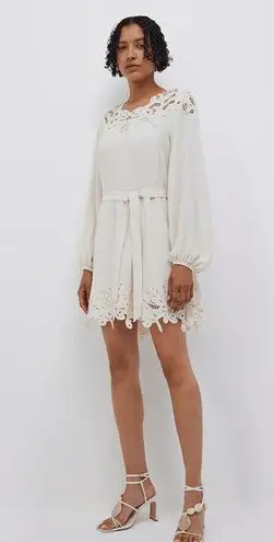 The Avra Mini Dress in Ivory. Paisley lace embroidery decorates a relaxed mini dress silhouette with puffed long sleeves, and handkerchief hem. Self tie belt at waist. Style 422-1020-E Button closure at back Self-tie at waist Synthetic Dry clean only