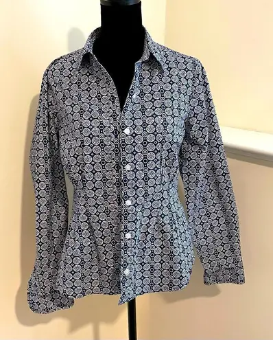 Fitted Women’s Blouse-Navy and white with a fun print.