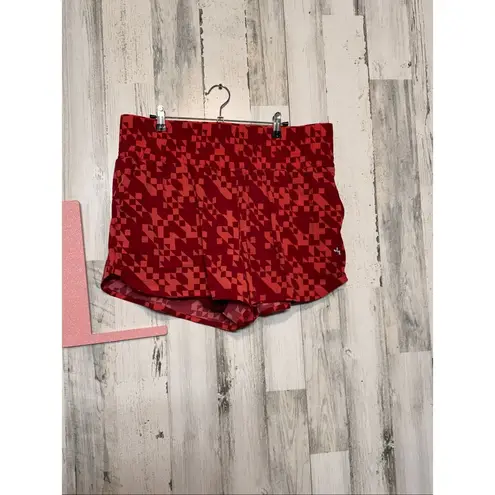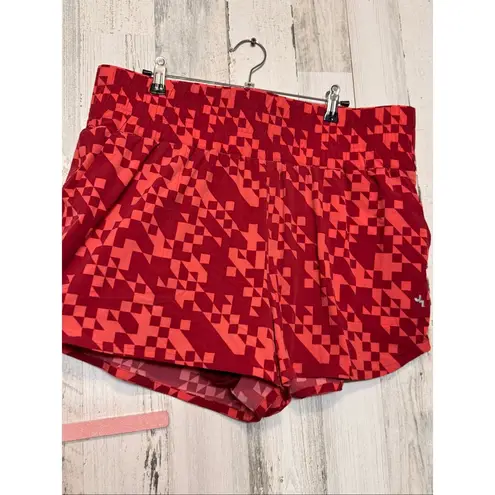 Size: XL Measurements (approx using AI): • Waist: 18.5” (flat, elastic waistband stretches) • Rise: 12” • Inseam: 3” • Total length: 14.5” Smoke-free home No rips No stains Ships fast — same or next day Measurements are estimated using AI based on mannequin fit. Please allow slight variation. Fabric: Shell: 88% Polyester, 12% Spandex Lining: 100% Polyester Features: • Geometric red and coral pattern • Built-in inner liner for comfort • Elastic waistband for flexible fit • Lightweight and quick-dry fabric • Perfect for workouts, running, or casual wear