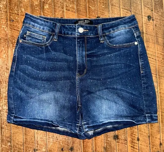 Judy Blue distressed, polka dot/speckled, medium wash, denim shorts. Pairs well with a flowy blouse or basic tee. Approximately 15 inches across the waist, 11 inch rise, and 3.5 inch inseam. In good, used condition. From a pet and smoke free house.
