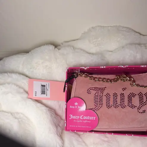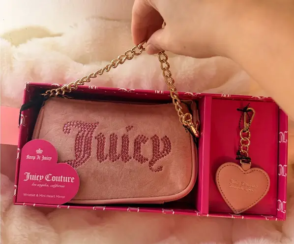 Chic Juicy Couture wristlet with heart keychain. Pink rhinestone logo and gold chain detail.