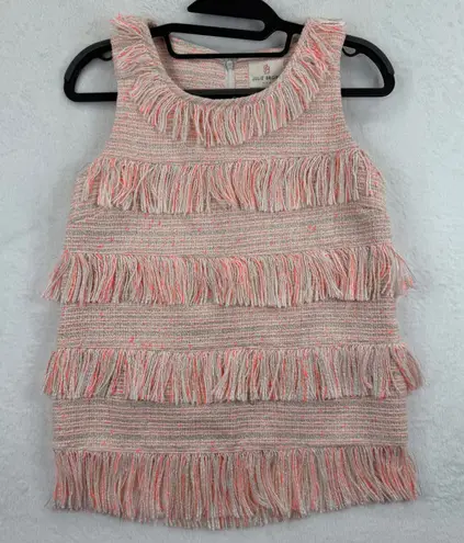 Color: Pink Type: Blouse Department: Women Style: Camisole Material: 100% Polyester Neckline: Round Neck Sleeve Length: Sleeveless Accents: Fringe Features: Collarless, Textured, Sleeveless Keywords: Julie Brown, Tweed top, Fringed top, Sleeveless top, Size 4, Pink top, Gold top, Party top, Retro top, Womens top, Blouse, Tank top, Festival top, Unique top, Textured top, quiet luxury, minimalist, old money, retro Thank you for viewing my listing! Please see the photos for a detailed look at its CONDITION and MEASUREMENTS. All preowned items have been steam cleaned and/or washed. Feel free to reach out with any questions.
